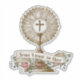 This beautiful contour sticker features a traditional Catholic image of the Eucharist in the Gold Monstrance with flowers beneath. The text on the banner is "Jesus, I Trust in Thee.
