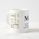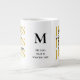 Stylish Christian coffee mug with some of the popular descriptions of the Lord JESUS displayed in a crossword format in bold black typography. In the background, the name of Jesus is repeated three times in gold coloured serif font. The design is repeated on the back. In the middle, there is placeholder text and a monogram, which are customisable, so you can add your name and initial or create your own text. This would make a great gift for birthdays, Christmas, and for anyone who loves the following inspirational quotes based on Bible Scripture: God will make a way in the desert; God always keeps His promises; Jesus is the Light of the world, and God is One who works miracles.