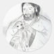 Hand drawn black and white pencil sketch of Jesus in a robe holding a small lamb.