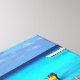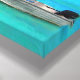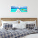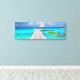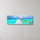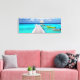 Panorama canvas landscape print of a wooden jetty with some colourful boats and a thatched hut in the turquoise blue lagoon of the tropical, Pacific island Rangiroa, close to Tahiti and Bora Bora in French Polynesia. Great summer decoration on your wall!
