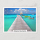 Postcard of a wooden jetty with some colourful boats and a thatched hut in the turquoise blue lagoon of the tropical, Pacific island Rangiroa, close to Tahiti and Bora Bora in French Polynesia with a white edge and the text 'French Polynesia'.