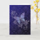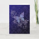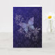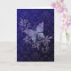 Elegant and stylish butterfly design: floral like swirls, and a butterfly with silk-like wings in shades of blue and lilac, decorated with shiny jewels, set on a background of dark blue damask.