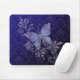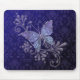 Elegant and stylish butterfly design: floral like swirls, and a butterfly with silk-like wings in shades of blue and lilac, decorated with shiny jewels, set on a background of dark blue damask.