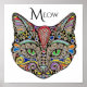 This poster features a whimsical and brightly coloured cat, with the word Meow at the top. Bohemian flair--or maybe it's Egyptian, because this cat looks rather queenly.