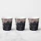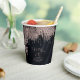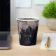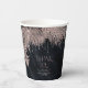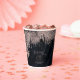 Opt for a striking, glitz and glam look by using the pieces in this wedding suite as shown, with jewels cascading off the diamond-encrusted palm leaves or delete the jewel layers for a slightly more conservative look. This set features leaves in shimmering rose gold against a dark navy blue, textured background. The wedding paper cup shown here has a border of sparkling leaves, a personal 'Thank You' message and the bride and groom's names and wedding date. Easily enter your details using the provided template. View the collection link on this page to see all of the matching items in this beautiful set or search ID830 to see additional color options for this design.