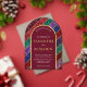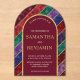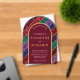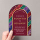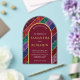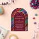 Customise this chic "Jewel Tone Luxury Arch Burgundy Gold Wedding Acrylic Invitations," featuring a multi-coloured jewel tone and faux gold stripe background and burgundy colour arch. Add bride's and groom's name, wedding date, venue name, and address. Please get in touch with the store designer for further customisation if needed.