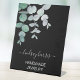 This unique pedestal sign is decorated with watercolor eucalyptus leaves on a black background. Easily customisable. Original Watercolor © Michele Davies.