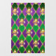 jewellery, background on Mardi Gras of purple and green rhombus, decorated gold lilies.