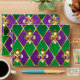 jewellery, background on Mardi Gras of purple and green rhombus, decorated gold lilies.