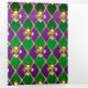jewellery, background on Mardi Gras of purple and green rhombus, decorated gold lilies.