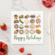 Design features an original illustration of an assortment of popular foods in Jewish cuisine, including: babka, bagel with cream cheese and lox, rugelach, blueberry blintzes, hamantash, reuben sandwich, kosher dill pickle, matzah, spinach knish, shakshuka, everything bagel, coconut macaroon, Israeli salad, kugel, bourekas, beef brisket, latkes with sour cream, matzo ball soup, sufganiyah, and a loaf of challah bread.