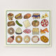 Design features an original illustration of an assortment of popular foods in Jewish cuisine, including: babka, bagel with cream cheese and lox, rugelach, blueberry blintzes, hamantash, reuben sandwich, kosher dill pickle, matzah, spinach knish, shakshuka, everything bagel, coconut macaroon, Israeli salad, kugel, bourekas, beef brisket, latkes with sour cream, matzo ball soup, sufganiyah, and a loaf of challah bread.