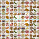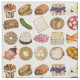 Fabric features an original illustration of an assortment of popular foods in Jewish cuisine, including: babka, bagel with cream cheese and lox, rugelach, blueberry blintzes, hamantash, reuben sandwich, kosher dill pickle, matzah, spinach knish, shakshuka, everything bagel, coconut macaroon, Israeli salad, kugel, bourekas, beef brisket, latkes with sour cream, matzo ball soup, sufganiyah, and a loaf of challah bread.