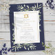 An elegant Jewish celebration of life funeral remembrance invitation featuring botanical watercolor greenery foliage on a navy blue background. Designed by Thisisnotme©