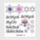 A beautiful sheet of 15 sticky labels. There are 9 Star of David faux silver edged stickers - 5 are plain silver, 2 have a bright pink middle and 2 have a navy blue centre. There are five flowing script templates with the words "Bar Mitzvah", "Bat Mitzvah", "Mazel Tov", "Yasher Koach and "Shabbat Shalom" respectively. The last sticker is a graphic art work of nine red glowing candles in a menorah with the words "happy chanukah" below the candles.