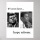 BLACK AND WHITE PHOTOS OF JFK AND OBAMA. TEXT SAYS: 45 YEARS LATER... HOPE REBORN.