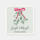 These green Christmas party napkins are decorated with watercolor mistletoe, a red ribbon, and stylish script typography that says "Jingle And Mingle"