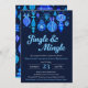 This Christmas party invitation design features hand painted watercolor vintage style Christmas bauble ornaments in blue and turquoiseon a dark navy blue background. The text reads 'jingle and mingle' and you can customise all of the event details. On the back of the invitation is a pattern of the same vintage christmas ornaments on dark blue. See the whole matching collection.