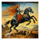 The A.I. created interpretation of Joan of Arc dressed in elaborate armor rides a majestic black horse fiercely through a surreal battle scene. Her orange and red cape flows dramatically in the wind along with her fiery red hair as she leads a charge with a raised sword.