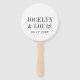 Modern wedding hand fans featuring a minimalist black and white design with your names in a large font along with your wedding date. The back has your personalised thank you message. This design is simple enough for a formal wedding yet makes a bold statement.