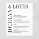 Modern budget wedding menu (printed on thin flyer paper) featuring a minimalist black and white design with your names in a large font along the left side and top. This design is simple enough for a formal wedding yet makes a bold statement.