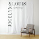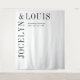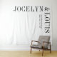 Modern wedding backdrop featuring a minimalist black and white design with your names in a large font along the left side and top. This design is simple enough for a formal wedding yet makes a bold statement.