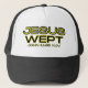 This trucker hat showcases a design that features the words "Jesus Wept" with King James John 11:35 bible scripture in a bold print print with yellow & black letters with yellow and black outline plus bible citation underneath in this faith based biblical theme. This hat is comfortable, casual and adjustable from 17 to 24" with a 100% nylon foam front and nylon mesh back great for everyday use or any special occasion.