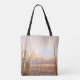 Inspirational scripture tote bag depicts a nature photograph with reeds on the beach and a beautiful ocean sunset. It features a portion of Bible Verse John 16:13, "When the SPIRIT of TRUTH comes, HE WILL GUIDE YOU INTO ALL TRUTH ... and he will declare to you the things that are to come."