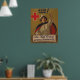 A Red Cross recruitment poster from World War I showing a Red Cross nurse seated at a desk, with her left arm raised.