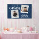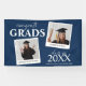 Modern double graduation party banner which features 2 photos of the graduate's. The banner has template text that reads 'CONGRATS GRADS, THEIR NAMES, YEAR OF GRADUATION, and THEIR SCHOOL OR COLLEGE NAME'. All font styles and colours can be changed by clicking on the customise further link after personalising.