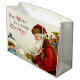 Nostalgic image of Victorian era red-robed Santa Claus carrying bag of toys receiving a letter from a shy child in blue coat and hat.