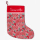 Decorate for Christmas with these jolly red and white poinsettia flowers personalised Christmas stocking. This red poinsettia Christmas stocking is fully customisable! You can edit the text by clicking "personalise this template". This personalised Christmas stocking features a red and white poinsettia floral pattern background and a space at the top to add your name in red cursive!