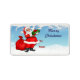 Festive Christmas theme label features a Jolly Santa Claus with his red bag and gifts. Blue sky and snow covered background. Customize text areas.