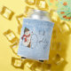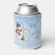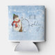 This cute Christmas can cooler design in blue features sparkling snowflakes as a backdrop for a fat jolly snowman and the handwritten script text 'Let's be Jolly'.