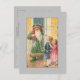 Jolly smiling green-robed Victorian Father Christmas carrying his sack of gifts being welcomed by two adorable children into their home. Background colour is editable. Back features custom complementary graphics with editable text fields.