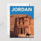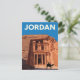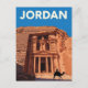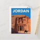 Step back in time with this dramatic retro travel postcard featuring the ancient wonder of Petra, Jordan. The design showcases the majestic Al-Khazneh (The Treasury) carved directly into the pink sandstone cliff, complete with a Bedouin riding a camel in the foreground. This bold artwork captures the historical mystique and dramatic scale of this incredible Middle Eastern landmark, making it a fantastic piece for history buffs and collectors of vintage travel posters.