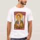 This T-shirt design by Christopher C. Smith depicts Joseph Smith painted in the style of a mediaeval Catholic saint. Clutching the Bible and the Book of Mormon—Mormonism’s two foundational books of scripture—he tilts his head in contemplation. A dove sits on his shoulder, symbolising the Holy Spirit, and a halo surrounds his head. He wears the rustic brown leather jacket of an unassuming nineteenth-century American prophet.
