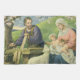 Vintage illustration religious design featuring Joseph's workshop with the Virgin Mary and a baby Jesus Christ feeding a lamb.