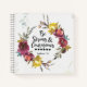 Inspirational scripture notebook, journal depicts a bright floral watercolor wreath made in an elegant botanical style with burgundy and yellow flowers and greenery. It features a portion of Bible Verse Joshua 1:9, "Be Strong and Courageous." Scripture tells us, Don't be afraid; don't be discouraged, for the Lord will be with us wherever we go. _