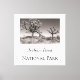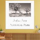 The image showcases a black and white photograph of a desert landscape featuring two prominent Joshua trees. The trees stand tall against a muted sky, their branches reaching out in a variety of directions. The foreground is filled with low-lying desert vegetation, creating a sense of depth and texture.