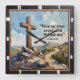 This evocative wall clock features a rugged wooden cross atop a rocky hill, with a winding path leading into distant mountains under a dramatic sky. The compelling words, "Take up your cross and follow me." - Luke 9:23, are prominently displayed. With its rich, textured artistry, this timepiece serves as a daily reminder of the personal journey of faith and the call to discipleship on life's winding path.