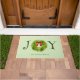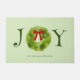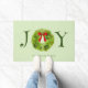 Rustic green Christmas theme doormat featuring watercolor illustration of a green wreath with a red bow. The text says "JOY" in a festive font. Add your family name at the bottom.