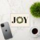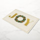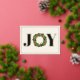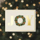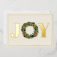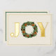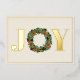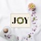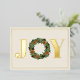 Send warm holiday wishes with this elegant Christmas card from the Rustic Dried Orange and Pine Holiday Collection by Porch and Gable Design. The front features the word Joy in shimmering gold foil and a hand painted watercolor wreath of pine sprigs, eucalyptus, dried oranges, cinnamon sticks, pinecones, and brass jingle bells. The ivory cream background and gold foil detailing add timeless elegance to this rustic, nature-inspired holiday design.