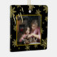 This festive yet elegant Holiday ornament is perfect as a family memento or Christmas present. It features a gold photo frame surrounded by a black background with a bounty of fun gold snowflakes. The caption reads "Joy!" There is space on the back for a short message or greeting, as well as your name(s) and the year.