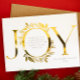 This design is ready for the festive season. A classic white background and hand drawn foliage wreath in gold foil set off this design. A wonderful message of joy for the holiday season and a photo area on the back, make this card perfect for Christmas.