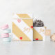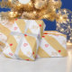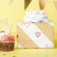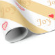 Joy hearts on diagonal golden and white striped gift wrapping paper.