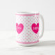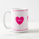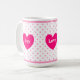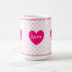 Beautiful mug with heart, pink polka dots and personalised joy, love, light text.