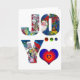 Whimsical bold alphabet letters with colourful hearts, cool artistic Christmas monogram design with original acrylic paintings ,Snowman and Santa Claus playing violin and sax in the snowy winter night ,an owl ,floral ornaments,bows,ribbons,toys ,winter plants, holly berries , bright red,green,blue,yellow 3D gemstones .