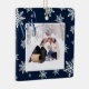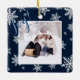 This fun ornament features a festive design with a navy blue background and white snowflakes. The front has a picture frame so you can upload your photo with a caption that reads: Joy! The back has a space to write a short greeting or message, as well as your name(s) and the year. Perfect Christmas present or annual family holiday memento.