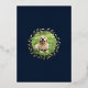 Elegant gold foil, "Joy, Peace, Happiness", holiday wreath photo greeting in blue and gold. The word Joy has a wreath for the letter O and this pretty leaf continues to the back of the card as a frame for an additional photo.